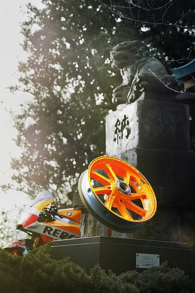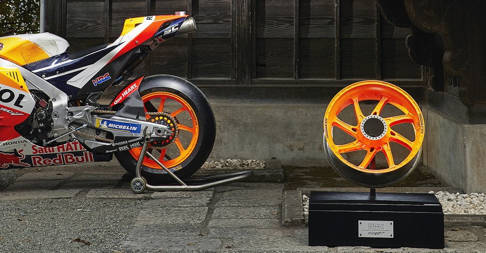 Les radiateurs, les tés de fourche, les platines, les guidons, les éléments de carrosserie, les axes de roue, les embrayages, les chaînes, etc., etc., etc. ? Oui, sans même parler de ce qui nous intéresse aujourd’hui, à savoir les jantes en magnésium des RC213V.