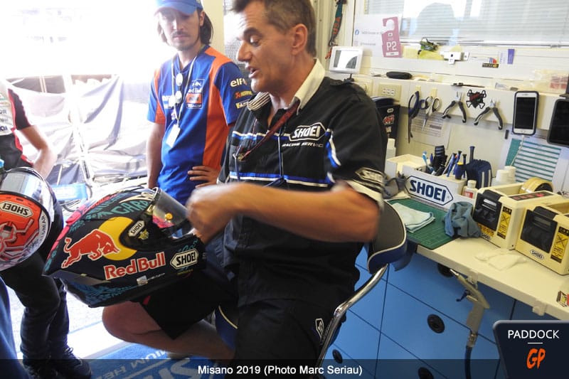 Nous avons également eu le privilège de découvrir les camions ateliers SHARK (Merci Gigi !) et SHOEI (Merci Mika !) et de tenir dans nos mains le casque de Jorge LORENZO ainsi celui de Fabio DI GIANNANTONIO (poleman en Moto2) qui a choisi pour son GP national une décoration spéciale Misano comme le fait chaque année VALE.