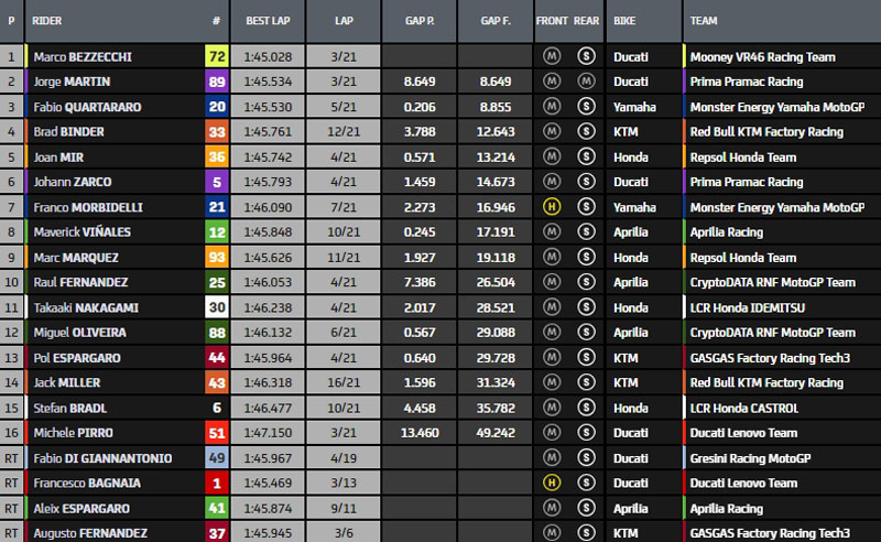 Le top10 est le suivant à 16 tours du but : Bezzecchi, Martin, Bagnaia, Quartararo, Mir, Binder, A.Espargaro, Morbidelli, Zarco et Di Giannantonio.