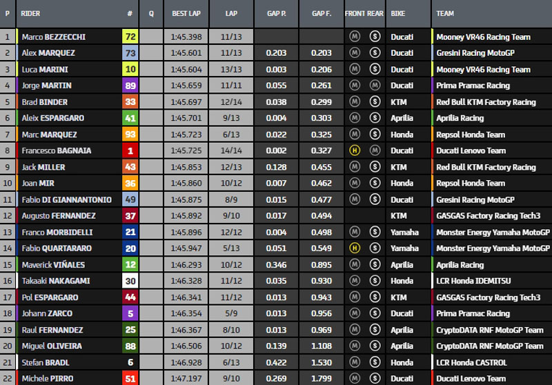 Fabio Di Giannantonio prend le relais en 1’46.645 devant Joan Mir, puis passe le relais à Marco Bezzecchi, lui-même s’inclinant devant Alex Marquez en 1’45.775.