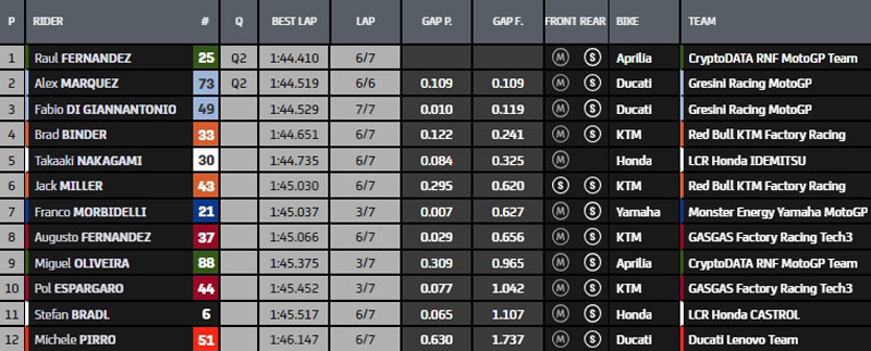 Ils sont maintenant rejoints par Raul Fernandez et Alex Marquez qui viennent de se repêcher en Qualification-1, et ces 12 pilotes (en fait 11 puisque Alex Marquez est au centre médical du circuit) disposent de 15 minutes, en pratique de deux runs, pour savoir quelle sera leur place sur les 4 premières lignes de la grille de départ.
