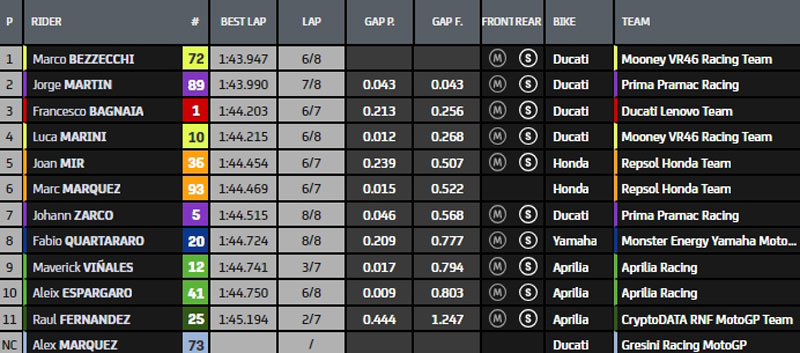 Après ce premier run, la hiérarchie est composée de Jorge Martin, Marco Bezzecchi, Luca Marini, Maverick Vinales, Fabio Quartararo, Johann Zarco, Francesco Bagnaia, Raul Fernandez, Marc Márquez, Aleix Espargaro, alors que Joan Mir n’a inscrit aucun chrono et Alex Márquez n’est pas présent.