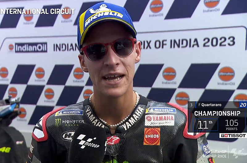 A peine descendu de sa Yamaha YZR-M1 officielle après avoir terminé 3e du Grand Prix MotoGP d’Inde sur le circuit de Buddh, Fabio Quartararo s’est confié devant les caméras du site officiel MotoGP.com avec la joie de retrouver un podium qu’il n’avait pas depuis les USA en GP…