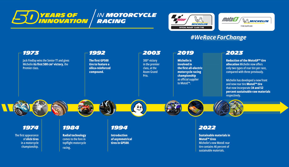« Le Pertamina Grand Prix of Indonesia revêt une importance toute particulière cette année pour Michelin. Le vainqueur de la course offrira à Bibendum sa 500ème victoire en Championnat du Monde FIM MotoGP. Une belle façon de célébrer 50 ans d’innovation en vitesse moto, depuis la victoire de Jack Findlay en Senior TT en 1973. Ce fut le premier succès pour Michelin en catégorie 500 cm3, classe reine de l’époque », souligne Piero Taramasso, manager de la compétition deux-roues de Michelin.