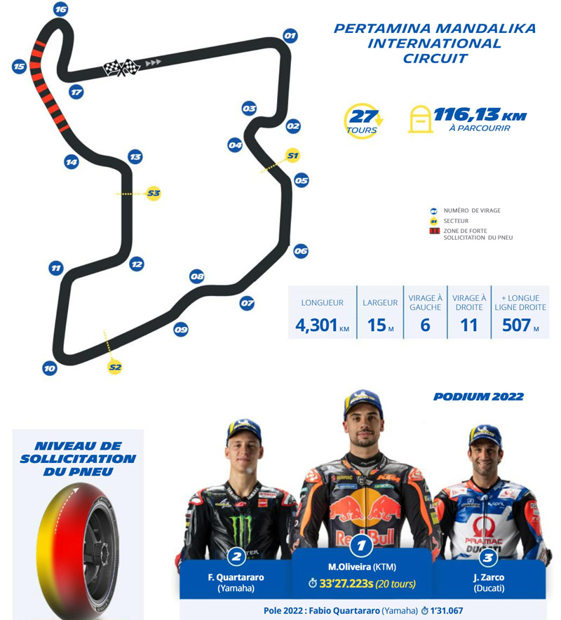 Inauguré le 12 novembre 2021, le Mandalika International Street Circuit est situé sur l’ile de Lombok, au sud de l’archipel indonésien. Avec seulement 4,3 kilomètres de longueur, ce tracé est assez court mais rapide. Il compte six virages à gauche et onze à droite, ainsi qu’une courte ligne droite de 507 m. Le profil est rythmé avec seulement deux zones de freinage appuyé avant les virages 1 et 10. Les machines les plus puissantes ne seront peut-être pas autant avantagées que sur d’autres circuits, ce qui promet une course très disputée avec l’Océan Indien en arrière-plan.