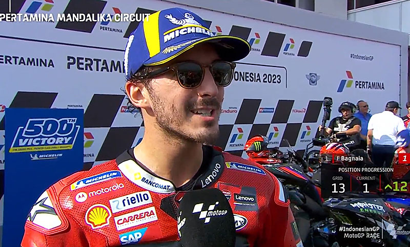A peine descendu de sa Ducati GP23 du officielle après avoir remporté un époustouflant Grand Prix MotoGP d’Indonésie sur le circuit de Mandalika, Francesco Bagnaia s’est confié devant les caméras du site officiel MotoGP.com avec la joie d’avoir fait une superbe course et d’inscrire une nouvelle victoire…