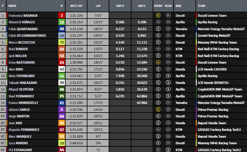 Après 2 tours, le top10 est le suivant : Martin, Vinales, Bagnaia, Espargaro, Binder, Quartararo,, Oliveira, MMarquez, Miller et Nakagami.