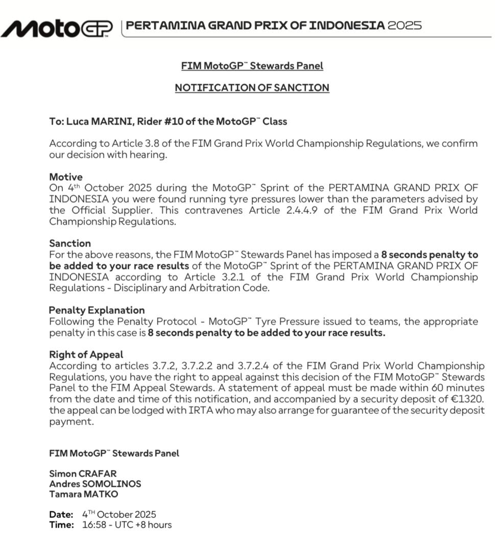 C’est officiel : Luca Marini, sixième à l’arrivée du Sprint en Indonésie, vient d’être pénalisé par la direction de course. En effet, après l’arrivée, une infographie nous indiquait que le pilote italien était sous enquête pour pressions non conformes, et, comme c’est souvent le cas, ça n’a pas manqué.