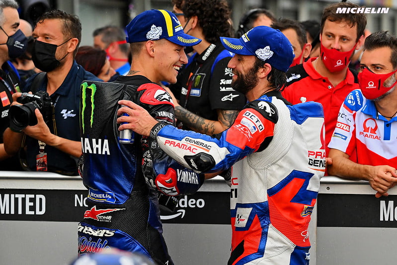 Johann Zarco : « Je suis heureux de ce podium ! Je m’attendais à en avoir un peu plus mais avec cette quantité d’eau en début de course cela m’a pris trop de temps pour être en grande confiance. J’ai été très impressionné par Miguel et Jack qui ont pu immédiatement prendre un rythme très élevé. Cela m’a manqué et j’ai aussi perdu du temps, un peu derrière Rins mais beaucoup plus derrière Jack, car à ce moment je pense que je pouvais aller vraiment vite et peut-être essayer de rattraper Miguel ou sauver la deuxième place avant que Fabio me dépasse. Mais j’ai perdu un peu trop de temps en motricité, je patinais trop en sortie de virage, et même si j’étais fort au freinage, ce n’était pas assez équilibré pour pouvoir doubler les autres rapidement. J’ai donc essayé de faire de mon mieux et quand Fabio m’a dépassé j’ai vu que je perdais complètement le podium. J’ai dû attaquer encore plus et j’ai pu prendre Jack car j’ai vu qu’il peinait avec l’adhérence à l’arrière, avant tout du côté droit. À partir de là, j’ai pu le doubler et j’ai eu la troisième place. J’ai attaqué durant les deux derniers tours pour essayer de rattraper Fabio mais Il se sentait également très bien et deux tours n’étaient pas suffisants. Donc une troisième place après un bon week-end, où il est vrai qu’en 24 heures je suis passé d’une chute en FP4 à la première ligne, puis à une course sur le mouillé où malgré peut-être quelques erreurs vous finissez sur le podium, c’est positif. »