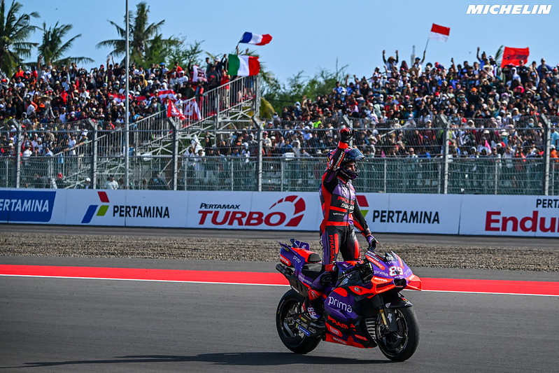 « Alors oui, je pense que je n’étais pas original parce que j’ai fait la même chose que Pecco à Montmelo après avoir traversé ce virage. Je ne sais pas s’il s’est arrêté. Je ne me souviens pas si tu t’es arrêté ou pas ? Le dimanche, quand tu a gagné, au virage 5 tu t’es arrêté ou pas ? Oui, je n’ai pas été très original, mais je me suis arrêté et j’ai embrassé le sol (rires). C’était un peu différent, mais c’est sûr que je pense que c’est encore mieux quand tu tombes et que tu gagnes, que quand tu gagnes toutes les courses, parce que le sentiment est comme une revanche. Donc aujourd’hui, c’était un bon feeling. Et oui, avec les fans indonésiens, c’était difficile de repartir parce qu’ils étaient tellement proches. Mais je suis heureux d’avoir pu la gagner (rires). »