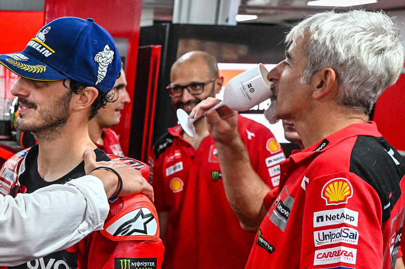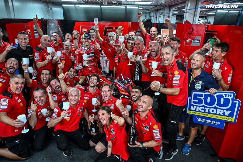 Un signe fort, un succès intensément désiré, souffert et conquis, en ayant tout donné, un véritable chef-d’œuvre après ce qui s’est passé dans les qualifications et dans la Sprint Race. Un exemple éclatant de la réaction et de la détermination d’un vrai champion, qui s’est montré immédiatement prêt lorsque les circonstances ont basculé en sa faveur, et il ne fait aucun doute qu’elles l’ont fait. Après avoir remporté haut la main la course Sprint du samedi, Jorge dominait également le GP avec une autorité impitoyable, trahie seulement par un excès de zèle. Bagnaia a simplement fait sa course, avec la fierté et la conscience d’y croire toujours : c’est ce qui l’a ramené à la victoire. C’est sa course splendide, et c’est cette attitude gagnante qui nous remonte le moral. Il a réalisé avec ténacité et talent un retour qui n’avait pas été vu sur le sec depuis des années ; un succès retentissant qui fait la différence et le ramène en tête du Championnat. Il reste cinq courses jusqu’à la fin de la saison : ce sera très dur. Ce qui s’est passé lors des dernières courses, y compris celle d’aujourd’hui, montre l’incertitude pour un défi entièrement Ducati qui promet d’être passionnant et entièrement dédié à l’esprit sportif. Nous sommes fiers de tout cela.