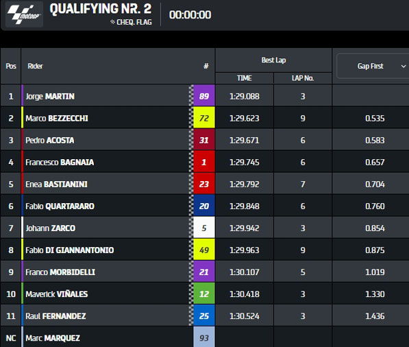 Le top 10 comprend également Marc Marquez (Gresini Racing) auteur d’un magnifique rattrapage, Pedro Acosta (KTM Team GASGAS Tech3) auteur d’un magnifique lowside, Fabio Di Giannantonio (Ducati VR46 Racing Team), et Maverick Viñales (Aprilia Factory), tous qualifiés directement pour la Q2.