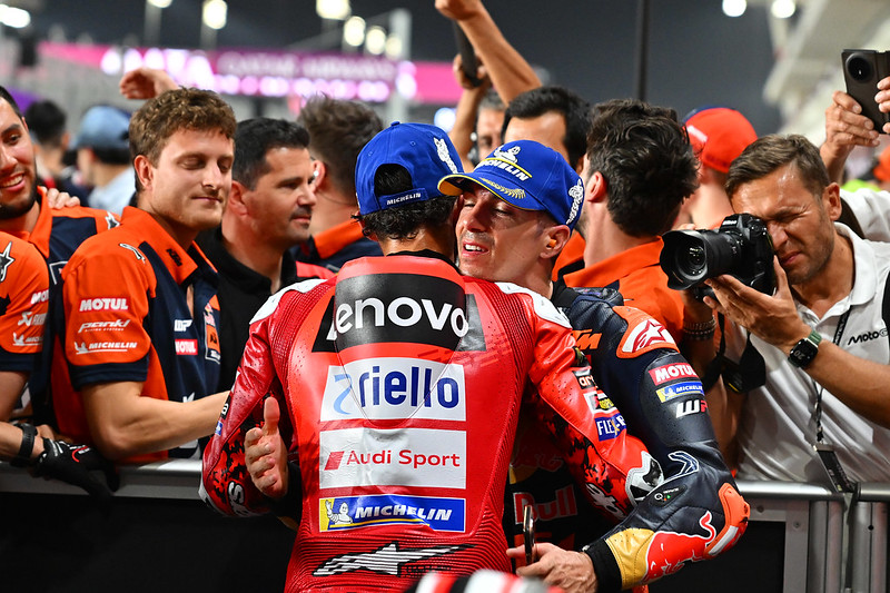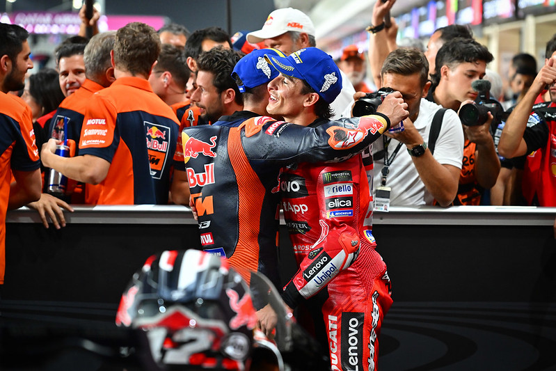 Alors tu peux me dire et tu ,aurais raison, parce que il a fait le weekend parfait, pole, victoire, victoire en Thaïlande, idem en Argentine, et il était parti pour faire la même aux USA mais on a vu un petit un petit clin d’œil du jeune Marc Marquez en course où il avait, on peut dire, course quasiment gagnée, et c’est lui qui s’est auto éliminé sur un excès peut-être d’enthousiasme. Mais en dehors de ça, il s’est remis de manière quasi parfaite en selle pour le Qatar, qui était un circuit où on l’attendait parce que autant l’Argentine et le Texas sont des circuits où ils survolent la concurrence depuis toujours, où il est très à l’aise en tout cas, alors que le Qatar n’est pas son tracé préféré. Et beaucoup de gens pensaient à Bagnaia, mais il a montré que même sur un circuit comme ça, il a refait le hat trick, pole victoire à la sprint, victoire à la course. Je pense qu’il est plus fort que jamais, et si aujourd’hui on ne dit pas que c’est le favori logique du championnat, on ne sait pas analyser ou on n’est pas honnête.