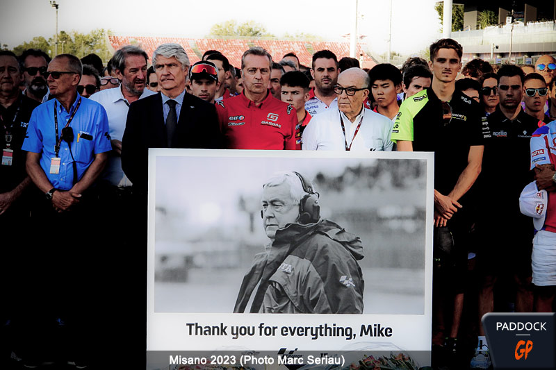 Et grâce à l’implication de tout le monde, je peux dire qu’entre l’Italie, Misano, l’Inde et le Japon, on faisait des des journées qui étaient plus près de 18 heures que 7 heures. Et je suis assez fier, pas de moi mais de la manière dont le paddock a réagi, de la manière dont les équipes ont compris qu’elles ne pouvaient pas systématiquement avoir le même entre guillemets service pendant un petit moment. Mais en tout cas, on a permis au show de continuer, on a permis à la machine MotoGP d’aller au bout de la saison. Le lundi 4 décembre, la grande majorité du paddock se retrouvera à Londres pour faire une journée qui s’appelle « Celebration of Life”, célébration de la vie, qui est organisée par son épouse Irène Trimby, pour tous se retrouver et faire un dernier adieu à Mike, puisqu’on n’a même pas le temps de lui rendre hommage chez lui, puisqu’on était dans l’avion qui nous emportait en Inde.
