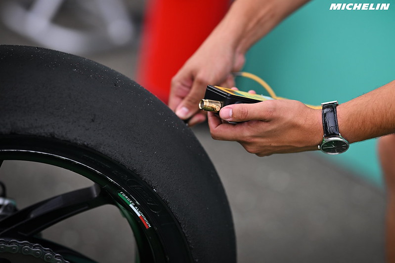« Alors ça dépend des pilotes, mais tu peux avoir une différence de température d’une dizaine de degrés. Pour te dire la vérité en course, le dimanche, il y avait deux pilotes qui pensaient partir avec, Luca Marini et Enea Bastianini. Eux, ils voulaient l’utiliser en course, et probablement qu’il aurait bien fonctionné, parce que quand tu es en course, que tu pousses tout le temps sur l’avant, que tu as le réservoir d’essence plein, là tu arrives à maintenir le pneu tout le temps sous contrainte et c’est plus facile de le garder en température. Et si en plus tu es dans l’aspiration des motos, c’est encore un point en plus qui t’aide à maintenir la température. Donc il aurait sûrement mieux fonctionné en course le dimanche, mais au dernier moment, comme les températures étaient descendues à 46 ou 47°, c’était un poil juste. Si on était resté sur les 50°, je pense que les deux pilotes seraient partis avec, donc il ne manquait vraiment pas grand chose pour qu’il puisse fonctionner correctement. »