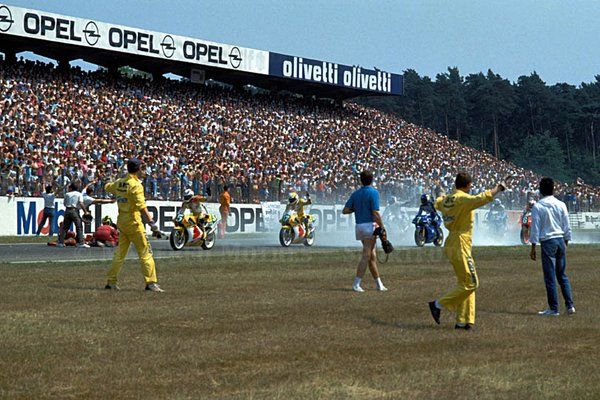 Enfin, beaucoup plus grave, lors d’un accident, survenu durant la course des 250cc, qui a coûté la vie au malheureux pilote vénézuélien Ivan Palazzese et gravement blessé Bruno Bonhuil et Fabio Barchitta, le directeur de course avait plus que tardé à montrer le drapeau rouge. Les commissaires de piste, paniqués, n’avaient pas non plus montré les bons drapeaux, et seule la présence d’esprit de Sito Pons, qui a réussi à arrêter le peloton alors que celui-ci revenait après un tour complet sur les lieux de l’accident absolument pas dégagé, a permis d’éviter un plus grand massacre.
