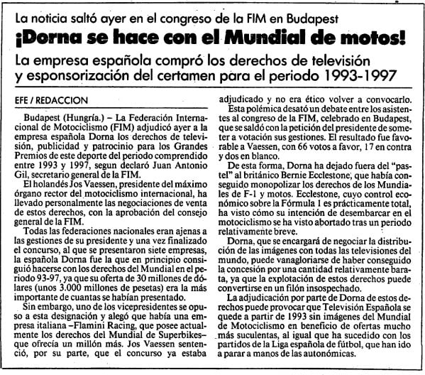 Après un nouveau délai et aucune offre supérieure (*), la FIM décide donc le 22 octobre de poursuivre les négociations avec «Promoción del Deporte», avec 66 voix pour, 17 contre et 7 abstentions, pour finaliser un contrat portant sur les droits TV et le marketing des courses de 1993 à 1997.