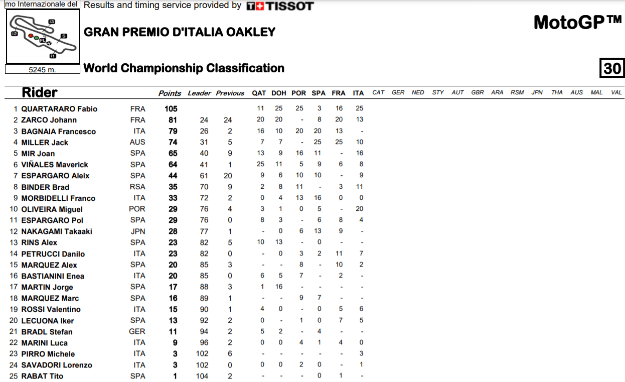 Les 25 du tricolore à la Yamaha valent donc leur pesant d’or comme les 13 unités ramenées par son compatriote de chez Pramac. En revanche, c’est la tuile pour Bagnaia qui quitte ses terres avec un zéro pointé. Second de Quartararo au général avec un point de retard en arrivant sur un site où tout un pays attendait de lui une première consécration à ce niveau de la compétition, le voilà troisième avec 26 longueurs de retard sur le même Fabio. Côté Miller, la cinquième place sauve tout juste les apparences. L’Australien sortait de deux victoires consécutives et venait de signer le renouvellement de son contrat. Cela étant dit, il revient à 5 points de son équipier…
