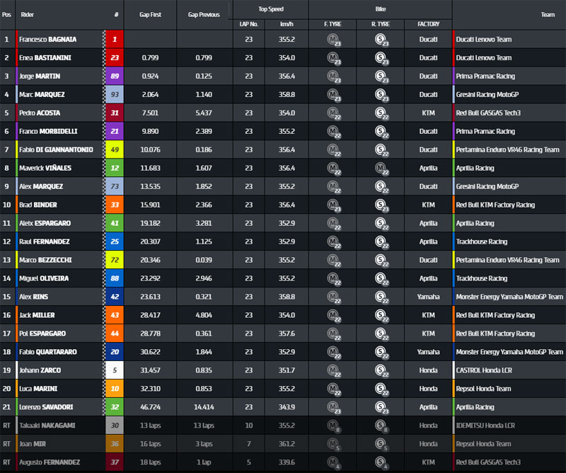 Peu à peu, Bagnaia prend le large, il creuse sur Martin avec 0.844s d’avance. Bastianini, MMarquez, Acosta, Morbidelli, Vinales, AMarquez, Di Giannantonio et AEspargaro ferment la marche de ce top10 à 16 tours du finish.