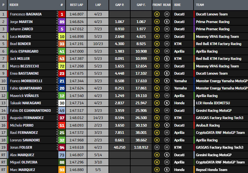 A 10 tours du but, le top10 se décline ainsi : Bagnaia, Martin, Marquez, Marini, Zarco, Binder, Miller, Espargaro, Bezzecchi et Morbidelli. Quartararo est 11e