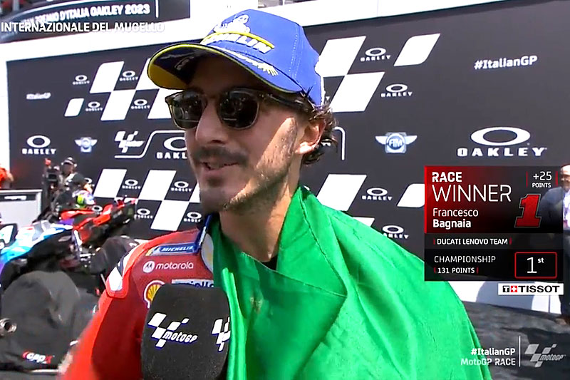A peine descendu de sa Ducati GP23 officielle après avoir remporté le Grand Prix d’Italie au Mugello, Francesco Bagnaia s’est confié devant les caméras du site officiel MotoGP.com avec la joie d’avoir effectué un sans-faute absolument parfait à domicile !