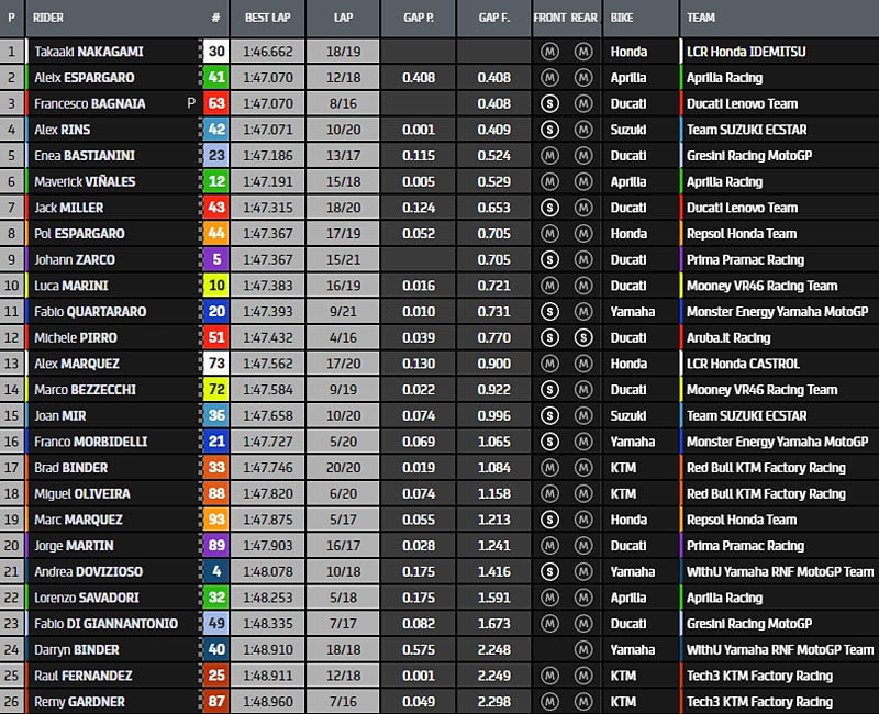 À quatre minutes du drapeau à damier, Maverick Viñales et Luca Marini améliorent et intègrent le top 10. À part Michele Pirro, personne n’utilise le pneu arrière tendre. Au tour d’après, Pol Espargaró se positionne septième ce qui repousse Fabio Quartararo en 10e position.
