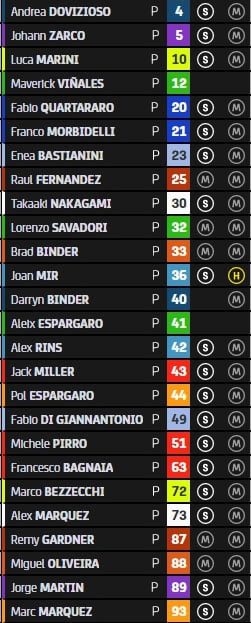 Pour le moment, Takaaki Nakagami, Aleix Espargaró, Francesco Bagnaia, Álex Rins, Enea Bastianini, Maverick Viñales, Jack Miller, Pol Espargaró, Johann Zarco et Lucas Marini sont pré-qualifiés pour la Q2.