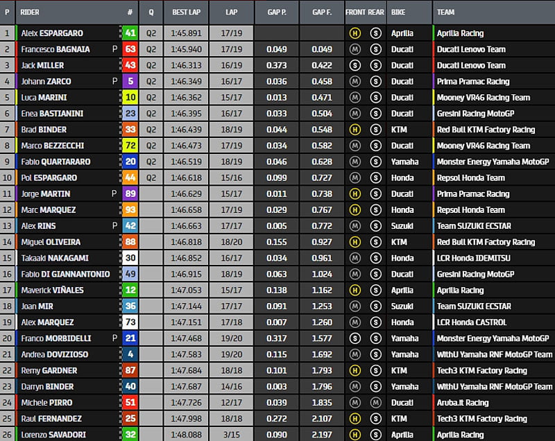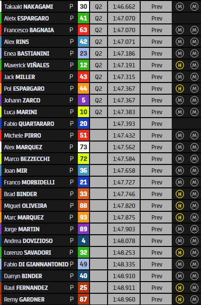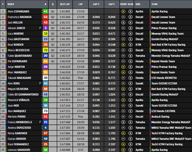 Pour le moment, Aleix Espargaró, Francesco Bagnaia, Jack Miller, Johann Zarco, Luca Marini, Enea Bastianini, Brad Binder, Marco Bezzecchi, Fabio Quartararo et Pol Espargaró sont pré-qualifiés pour la Q2, en attendant demain matin une FP3 à la météo incertaine…