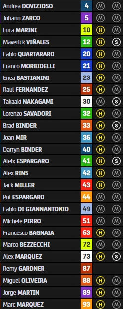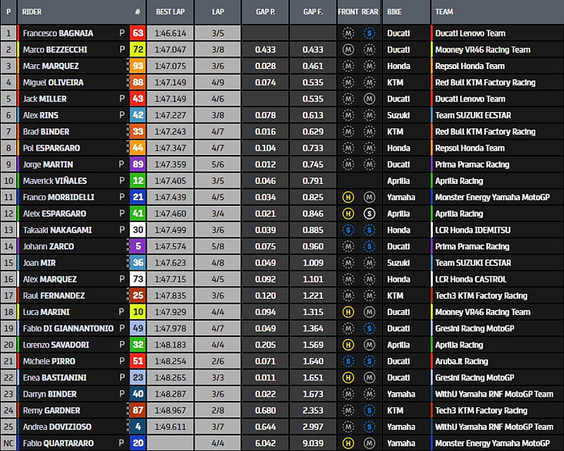 Au final, Francesco Bagnaia, Aleix Espargaro, Luca Marini, Johann Zarco, Marco Bezzecchi, Enea Bastianini, Jorge Martin, Pol Espargaro, Takaaki Nakagami et Fabio Quartararo sont pré-qualifiés pour la Q2, soit pas moins de six Ducati aux 7 premières places, seul Aleix Espargaro et son Aprilia, une fois de plus, empêchant Borgo Panigale d’écraser complètement ce Grand Prix.