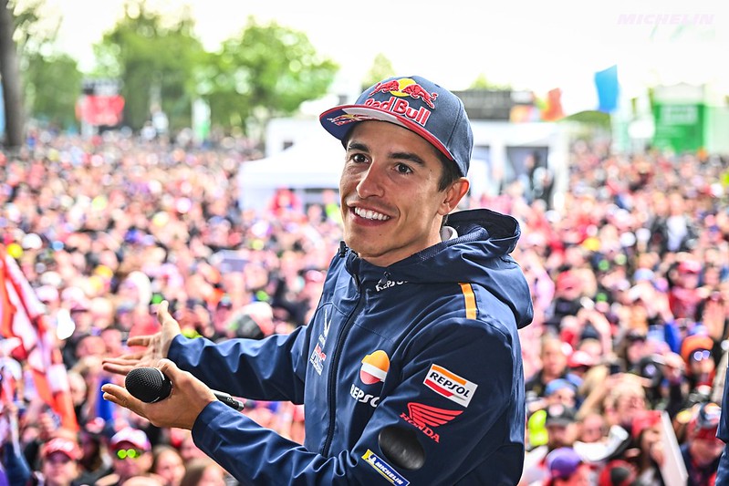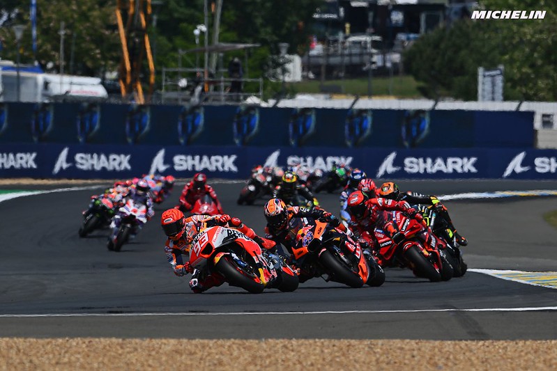 Marc Márquez : « Oui. Au Mans, j’ai pris du plaisir, j’ai pris beaucoup de plaisir. Pendant le weekend et la course en particulier, le rythme était bien meilleur que ce à quoi je m’attendais. Mais c’était comme ça. C’est vrai que je prends beaucoup de risques, et surtout en fin de course, la limite était plus ma condition physique que la moto. Et j’étais détruit avec quelques syndromes des loges dans les bras, mais après j’ai oublié, je n’ai pas réfléchi à ce que j’allais faire. J’ai juste continué à forcer, et continuer à forcer quand vous ne pilotez pas bien cette moto, vous pouvez faire une petite erreur comme je l’ai fait. Mais oui, j’ai l’impression d’être dans un très bon moment en ce qui concerne la condition physique. Je reviens à mon meilleur niveau, comme à Portimão, mais nous verrons bien. Ici, je pense que nous aurons plus de mal parce que les points faibles de notre moto et de mon style de pilotage se retrouvent sur ce circuit, mais en tout cas nous allons essayer de faire de notre mieux. »