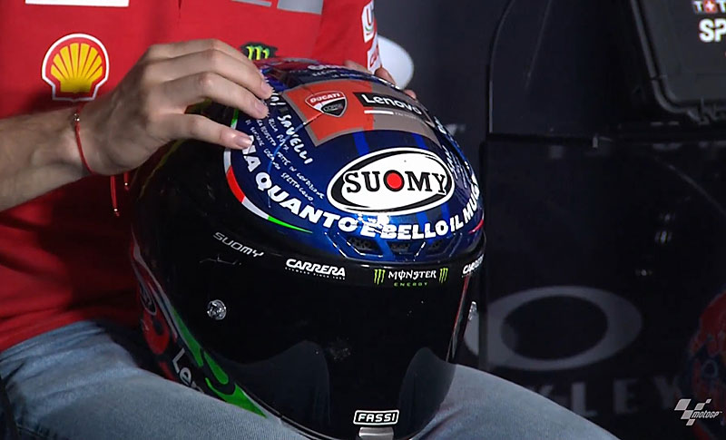 Et le casque. Le mien dit « qu’il est beau le Mugello ! ». Et puis j’ai écrit un papier avec ce que je pense des virages les plus importants du circuit, à savoir Casanova, Savelli, Bucine, San Donato. Ce que je pense, je l’ai mis et puis il y a la piste, le tracé. Oui, oui, c’est là que se trouve mon fan club, après Scarperia. Et puis rien, j’avais le drapeau avec le 63, avec ma famille, rien de plus. Je pense que c’est une bonne idée. Et c’était comme un hommage au Mugello, qui est toujours fantastique. »