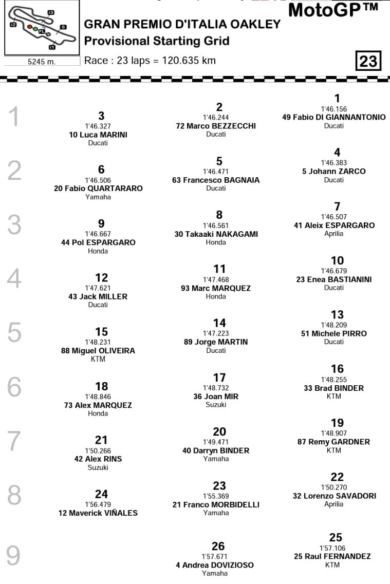 MotoGP Italie Mugello : grille de départ