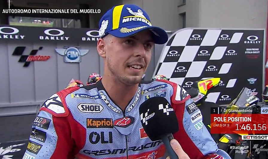A peine descendu de sa Ducati GP21 du team Gresini Racing MotoGP après avoir obtenu la pole position du Grand Prix d’Italie sur le circuit du Mugello, Fabio Di Giannantonio s’est confié devant la caméra du site officiel MotoGP.com avec la joie de sa première pole position en MotoGP.