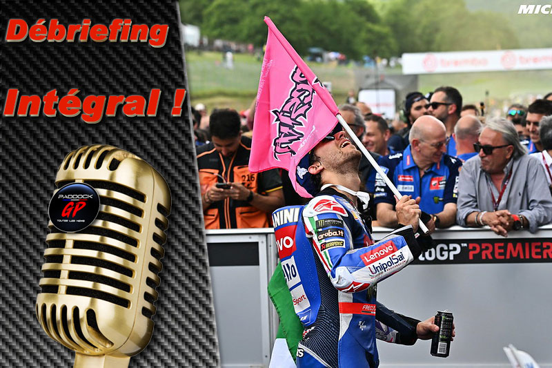 Bienvenue à la conférence de presse d’après course à la fin du Grand Prix Brembo d’Italie, ici au Mugello. Incroyables scènes d’après course sur la ligne de départ et d’arrivée, alors que les fans italiens célèbrent une atmosphère spéciale après une victoire spéciale pour le pilote de l’équipe Ducati Lenovo, et champion du monde en titre, Pecco Bagnaia. Deux victoires consécutives ici au Mugello pour Pecco, félicitations Pecco ! Son coéquipier Enea Bastianini complète le 1-2 de l’équipe Ducati Lenovo dans la livrée spéciale Blue Azuri. Enea, premier podium ici au Mugello ! Et le leader du championnat du monde, le pilote Prima Pramac Racing Jorge Martin, complète le podium en 3ème position.