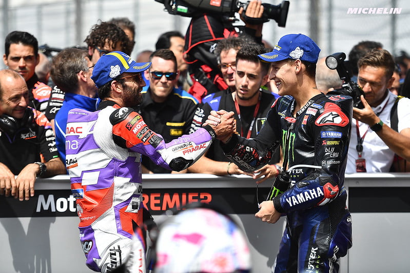 Ensuite, on doit toujours se battre lors des débuts de course, mais la confiance sur la moto devient toujours meilleure et je peux essayer de me battre. Clairement, vous essayez parfois des choses et vous perdez un peu de temps et les autres pilotes vous redoublent rapidement, avant tout Aleix et Fabio car ils ne perdent pas de temps dans ce domaine. Cela a été une bonne bagarre. Puis, à un moment de la course, une sorte de groupe s’était échappé et j’ai pu les rattraper. À ce moment, j’étais heureux car le chrono était très bon, ce qui veut dire que ma vitesse était vraiment bonne et le feeling était excellent. À ce moment, Bastianini restait avec moi car c’était juste après avoir doublé Di Giannantonio. Je sais que Bestia est fort en course depuis le début de l’année et je n’avais aucun doute qu’il serait là, qu’il pourrait rester avec moi et même me doubler. Puis il a chuté et à ce moment j’ai pu respirer un peu pour gérer mon rythme derrière Bezzecchi. Mais quand j’ai voulu doubler ce dernier pour rattraper Aleix, c’était trop difficile ! J’ai vraiment essayé de rester aussi près que possible pour prendre l’avantage quelque part, mais je n’ai pas pu le faire : même en ligne droite, je n’étais pas assez rapide pour me rapprocher. Et au freinage, quand vous arrivez 10 km/h plus vite grâce à l’aspiration, il est impossible de mieux freiner, surtout avec un gars qui freine très tard. J’ai alors essayé de prouver un endroit mais c’était trop difficile, puis j’ai pu le surprendre dans le dernier tour entre les virages deux et trois. J’ai alors encore davantage forcé car peut-être qu’Aleix subirait une détérioration de ses pneus, mais il contrôlait parfaitement. J’ai donc manqué le podium mais c’était une bonne quatrième place et c’est très bien. »