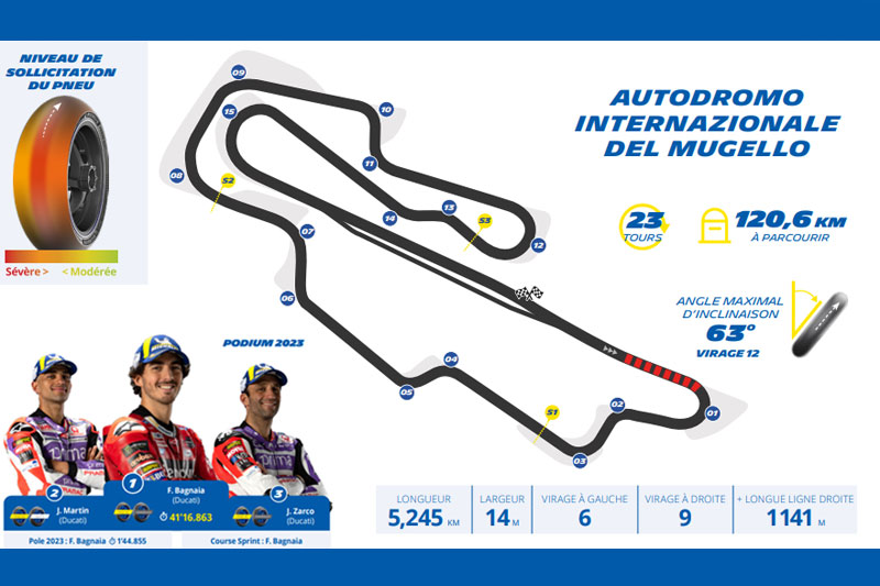 Le circuit du Mugello accueille le Championnat du Monde FIM MotoGP depuis près de 50 ans (1976). C’est aussi cette année que le site fêtera son demi-siècle d’existence avec un tracé qui est devenu permanent en 1974. Au fil du temps son développé n’a pas changé, tout comme son cadre champêtre, au cœur de la Toscane. Situé non loin de Florence, très apprécié des pilotes, le Mugello compte neuf virages à droite et six à gauche, pour une longueur de 5,245 km. Il est aussi le circuit qui recèle la plus longue ligne droite du championnat : 1,141 km. Alors que de nouvelles références chronométriques y ont été établies en 2023, chaque pilote aura à cœur de tenter de battre ces records qui témoignent de l’amélioration permanente de leurs motos. Des performances rendues possibles, également, par les progrès réalisés par les gammes pneumatiques Michelin, dont les mélanges revisités pour la saison 2024 accompagnent l’évolution de ces machines de pointe.