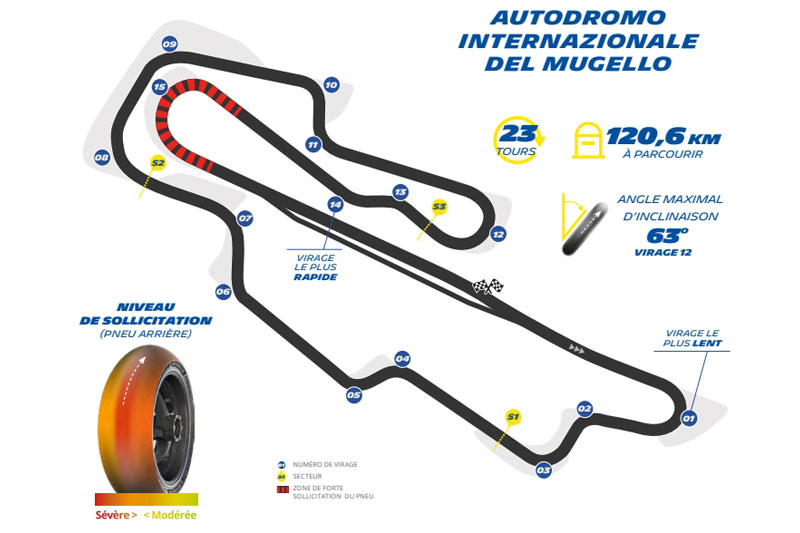 Le circuit du Mugello est devenu un lieu emblématique et incontournable du Championnat du Monde FIM MotoGP, qu’il accueille depuis 1976. Son tracé, inchangé depuis ses débuts, est parfaitement maîtrisé par les pilotes. Tous apprécient également le charme paisible de cette région reculée mais envoûtante de la Toscane. Situé à proximité de Florence, le circuit s’étend sur 5,245 km et propose un enchaînement technique de neuf virages à droite et six à gauche. Il est aussi réputé pour abriter la plus longue ligne droite du championnat (1,141 km), ce qui représente un véritable terrain d’expression pour la vitesse pure.