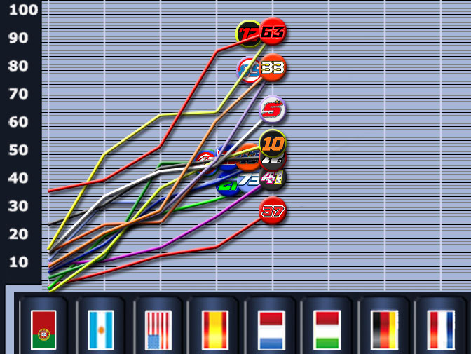 Derrière le Français, un groupe de 8 pilotes, emmené par Luca Marini et comprenant Fabio Quartararo, sont au coude à coude et encore tout à fait dans la course pour engranger le maximum des 555 points encore disponibles