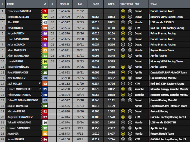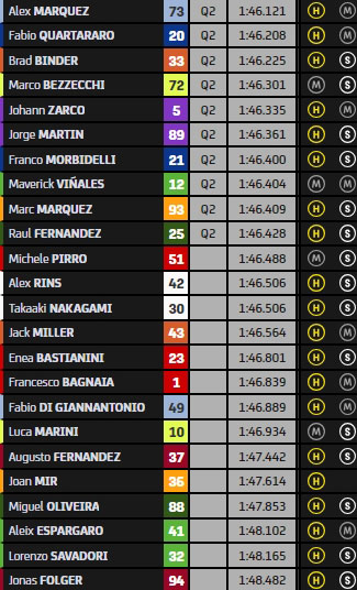 Les 10 pilotes qui passeront directement en qualification-2 sont donc Francesco Bagnaia, Marco Bezzecchi, Alex Rins, Brad Binder, Jorge Martin, Enea Bastianini, Johann Zarco, Marc Márquez, Aleix Espargaro et Luca Marini.