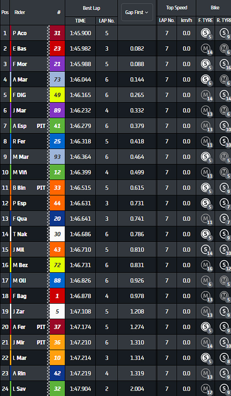 Au passage suivant, le numéro 23 est en 1’45.982, cette fois devant Pedro Acosta, Aleix Espargaro, Alex Márquez et Jorge Martin.