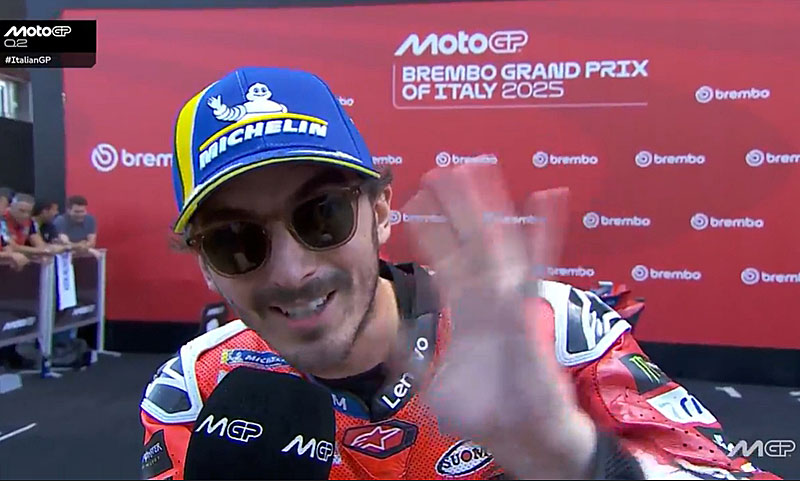 A peine descendu de sa Ducati GP25 du team d’usine Ducati Lenovo après s’être qualifié 1er pour le Grand Prix d’Italie MotoGP 2025 au Mugello, Francesco Bagnaia s’est confié devant les caméras du site officiel MotoGP.com avec la joie de retrouver le Mugello et la première ligne…