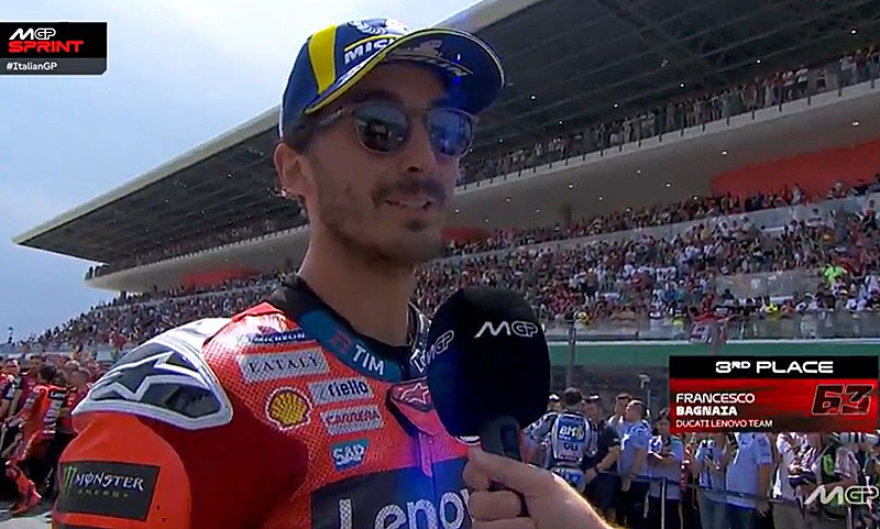 A peine descendu de sa Ducati GP25 du team d’usine Ducati Lenovo après avoir terminé 3e du Sprint du Grand Prix d’Italie MotoGP 2025 au Mugello, Francesco Bagnaia s’est confié devant les caméras du site officiel MotoGP.com avec une certaine tristesse de ne pas avoir pu faire mieux sur ses terres du Mugello…