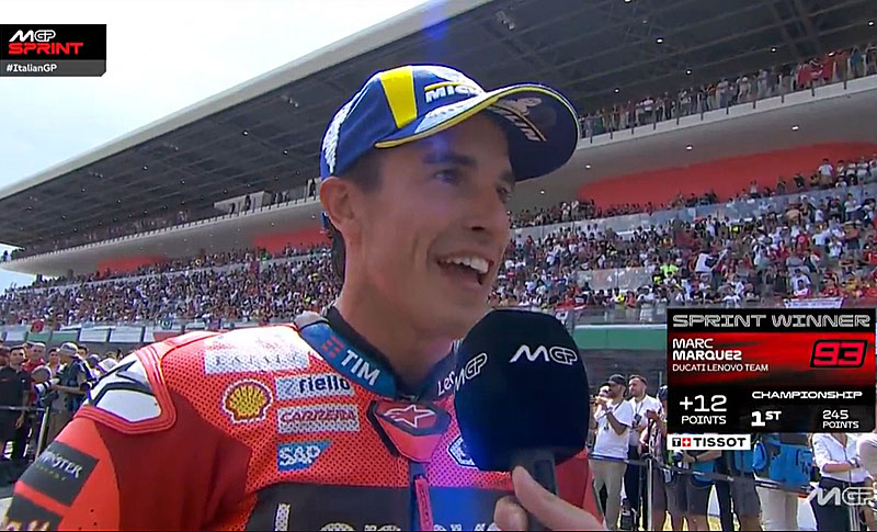 A peine descendu de sa Ducati GP25 du team d’usine Ducati Lenovo après avoir remporté Sprint du Grand Prix d’Italie MotoGP 2025 au Mugello, Marc Marquez s’est confié devant les caméras du site officiel MotoGP.com avec un certain amusement des sifflets provenant des tribunes…