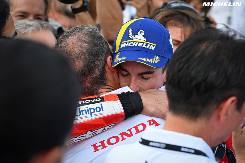 Et pour moi, le plus beau… Je veux dire, l’avenir est l’avenir, et parfois quelqu’un semble écrire l’avenir, et nous bouclons le cercle, au Japon, là où j’ai remporté mon dernier championnat du monde, au Japon où j’ai pris la décision de suivre une autre voie, et sur un podium où se trouvait toute l’équipe Ducati et mon équipe Honda. Donc, une manière parfaite. »