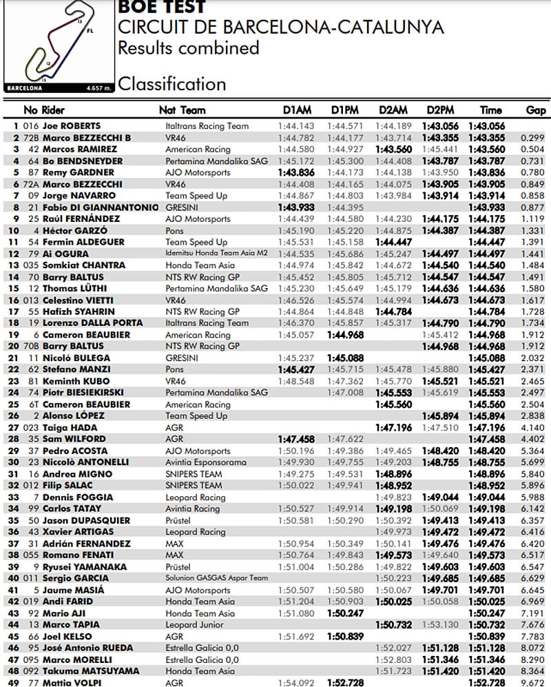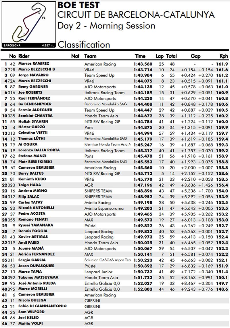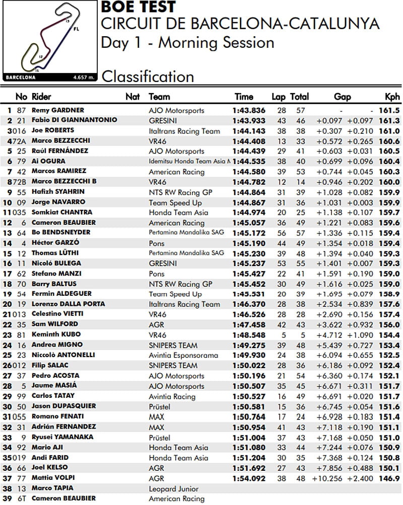 L’Australien néanmoins a joué le jeu en montant un transpondeur, et il est intéressant de noter qu’en 1’45.183, il s’est avéré moins rapide que quatre pilotes de la catégorie intermédiaire, Fabio Di Giannantonio  (Federal Oil Gresini Moto2), Sam Lowes (Marc VDS Racing), Augusto Fernández (Marc VDS Racing) et Somkiat Chantra (Idemitsu Honda Team Asia).