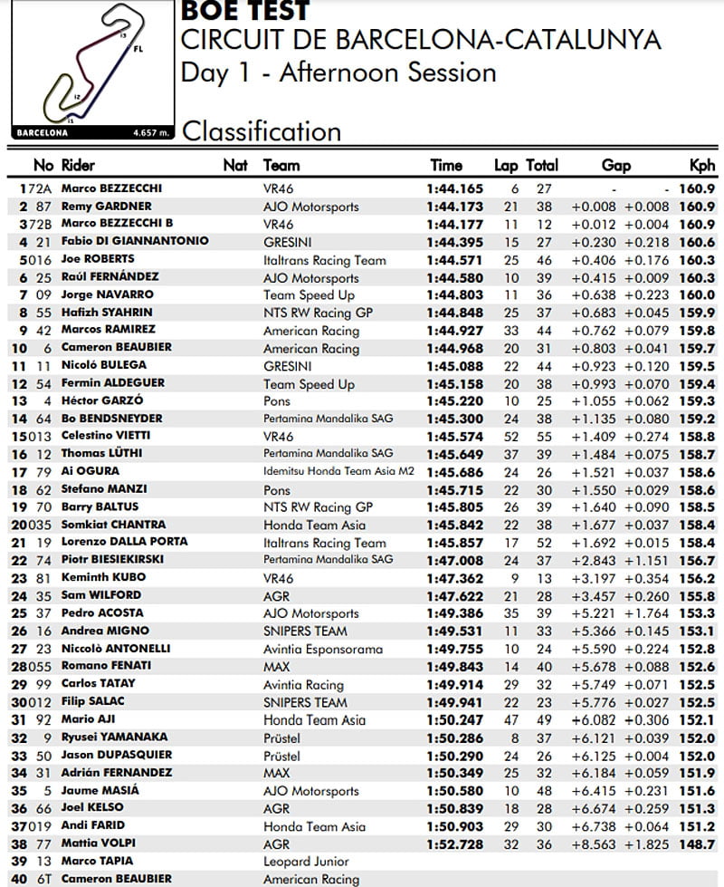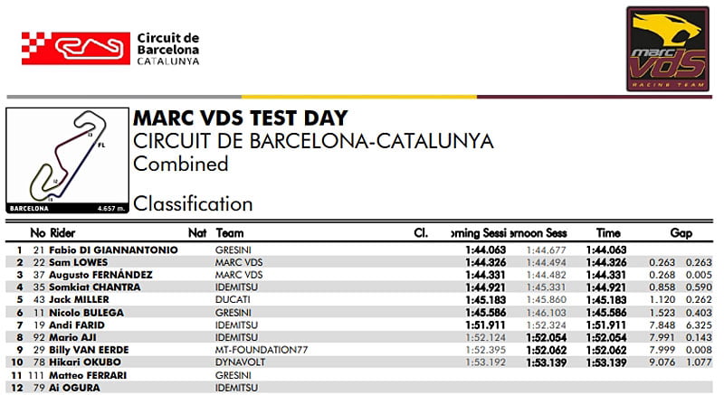 La première journée, sèche mais venteuse, la piste catalane était louée par le team Marc VDS Racing, et sur les 12 pilotes présents, seuls 10 étaient équipés de transpondeurs.