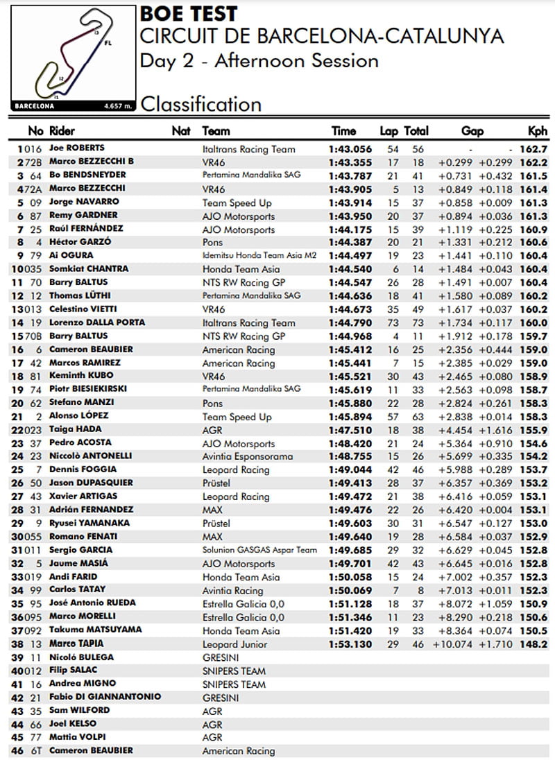 L’après-midi, avec une piste plus propice, c’est toutefois Joe Roberts qui profitait de ces conditions bien plus accueillantes pour imposer sa Kalex du team Italtrans 3 dixièmes devant tout le reste du plateau. Quatrième hier, l’Américain confirme sa vitesse, même si la place de sixième au championnat qu’il occupe actuellement est déjà à 58 points du leader Remy Gardner.