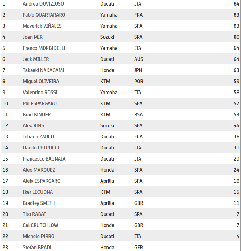 Quoi qu’il en soit, cette valse des vainqueurs nous amène à découvrir le championnat le plus ouvert de l’histoire. Les quatre premiers ne sont séparés que par quatre points. Dovizioso mène avec un avantage d’une unité sur Quartararo et Vinales, qui sont à égalité, et quatre sur Mir. Et la liste des candidats pourrait être étendue à bien d’autres, car les dix premiers ne sont qu’en 27 points.