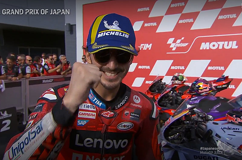 A peine descendu de sa Ducati GP24 officielle après avoir remporté le Grand Prix du Japon MotoGP 2024 à Motegi, Francesco Bagnaia s’est confié devant les caméras du site officiel MotoGP.com avec la joie d’avoir fait un week-end parfait et de revenir à 10 points au championnat…