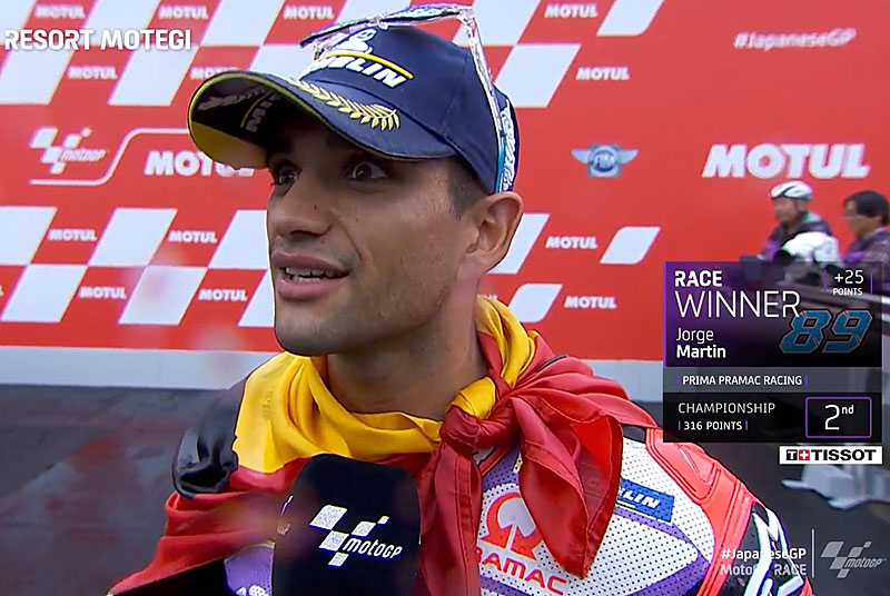 A peine descendu de sa Ducati GP23 du team Prima Pramac après avoir remporté un époustouflant Grand Prix MotoGP du Japon sur le circuit de Motegi, Jorge Martin s’est confié devant les caméras du site officiel MotoGP.com avec la joie d’inscrire une nouvelle victoire dans des conditions dantesques…